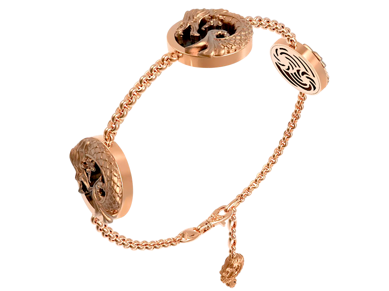 Этот браслет – для тех, кто не боится заявить о себе! Выполненный из сверкающего золота, он словно оживает на Вашей руке, демонстрируя мощь и величие.Искусно выгравированные драконы, обвивающие звенья браслета, символизируют силу, мудрость и защиту. Они оберегают своего владельца от негативной энергии и дарят ему уверенность в себе. Глубокий черный оникс, расположенный в центре композиции, добавляет браслету загадочности и элегантности. Считается, что он помогает принимать взвешенные решения и обрести внутреннюю гармонию. Золотой браслет с драконами и ониксом – это не просто украшение, это заявление о Вашей сильной личности и неповторимом стиле.  Он станет Вашим талисманом, притягивающим успех и оберегающим от невзгод.