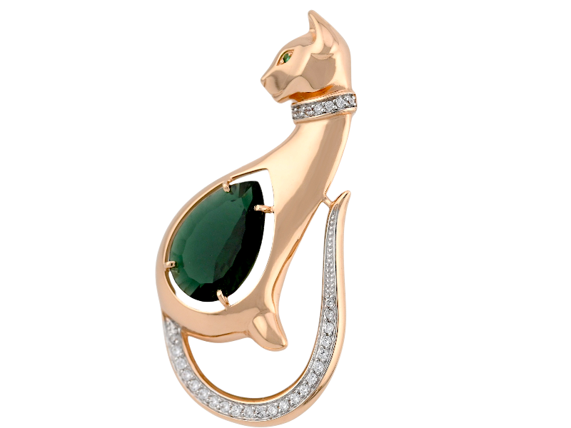 Невероятное украшение – золотая брошь в виде кошечки с зеленым турмалином! Эта брошь – настоящее произведение искусства, сочетающее в себе изящество линий и магию камней.  Турмалин – камень, известный своими целебными и магическими свойствами. Считается, что он приносит удачу, гармонию и защищает от негативной энергии. Брошь станет не просто украшением, а настоящим талисманом для своей обладательницы. Она подчеркнет индивидуальность, добавит образу нотку игривости и загадочности.