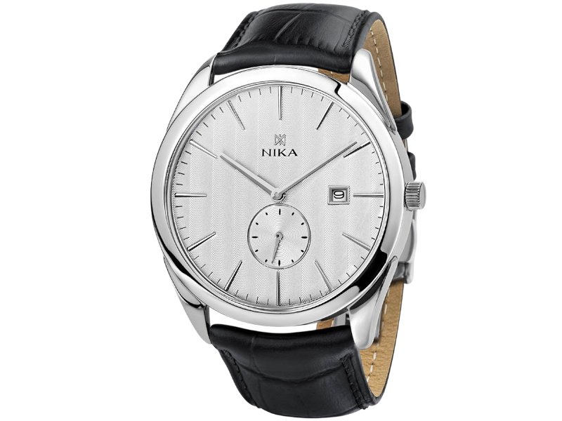 Серебряные мужские часы с ультратонким корпусом. Циферблат декорирован респектабельным узором «женевские волны». Секундная стрелка вынесена на отдельный малый циферблат. Кожаный ремешок комплектуется удобной застежкой-бабочкой.