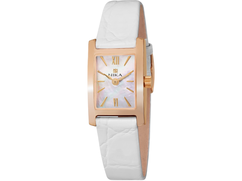 Золотой корпус женских часов выполнен в форме компактного прямоугольника. Спокойный циферблат выглядит насыщеннее благодаря золотистым часовым индексам. Идеальный вариант под строгий деловой костюм.