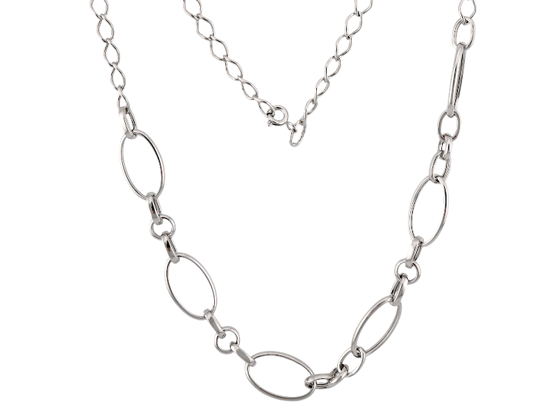 Это колье из белого золота выделяется своими крупными овальными звеньями, которые чередуются с мелкими круглыми. Такой дизайн создает интересный визуальный эффект и привлекает внимание. Оно станет выразительным акцентом вашего наряда и подойдет для особых случаев.