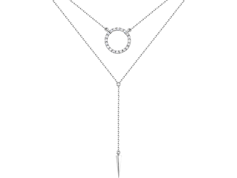 Верхний слой представляет собой тонкую цепочку серебристого цвета, которая плавно заканчивается круглым кулоном, украшенным мелкими бриллиантами, искрящимися на свету. Нижний слой цепочки располагается ниже, его завершает изящный заостренный кулон, добавляющий завершенности и глубины общему дизайну.