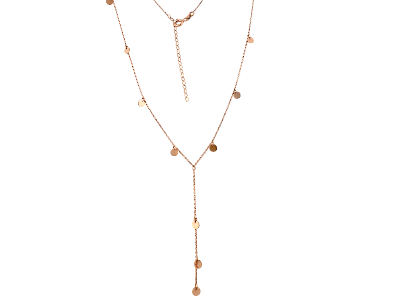 Тонкая золотая цепочка создает легкий и воздушный вид. На ней расположены маленькие круглые диски, которые гармонично чередуются через регулярные промежутки. Колье оснащено надежной застежкой и регулируемой цепочкой, что позволяет легко подгонять его под размеры шеи.