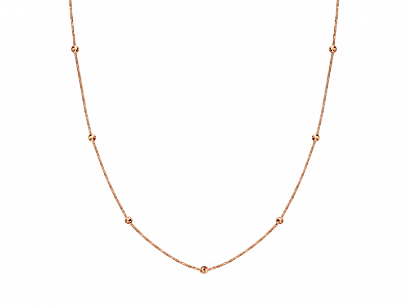 Элегантное золотое колье с оригинальным дизайном — изящная цепочка украшена равномерно расположенными гладкими золотыми шариками. Легкое и утонченное, такое украшение хорошо сочетается как с повседневным, так и с вечерним образом.