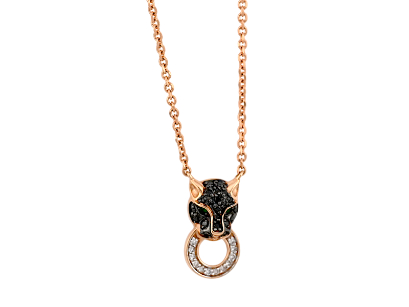 Это колье – воплощение грации и силы, вдохновленное образом пантеры. Искусно выполненное из благородного красного золота, оно излучает тепло и роскошь. Голова пантеры инкрустированы россыпью сверкающих черных бриллиантов, которые придают взгляду хищный блеск и загадочность. Изумруды глубокого зеленого оттенка, вставленные в качестве глаз, добавляют изделию нотку экзотики и притягивают к себе внимание.