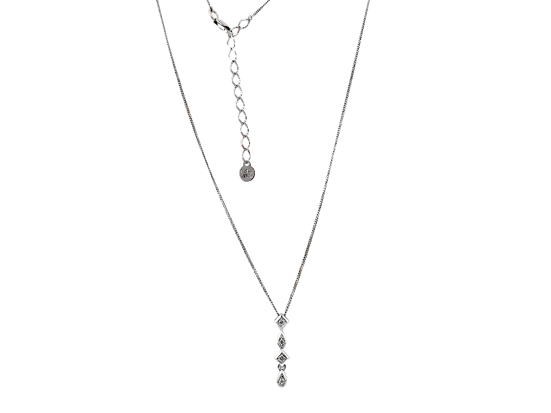 Это изящное колье выполнено из белого золота и украшено подвеской в виде вертикальной композиции. Кулон состоит из трёх небольших ромбов и каплевидного элемента в основании, каждый из которых инкрустирован сияющими камнями. Лёгкая и утончённая цепочка отлично подчёркивает элегантность украшения. Колье идеально подойдёт для особых случаев и добавит вашему образу нотку изысканности и блеска.