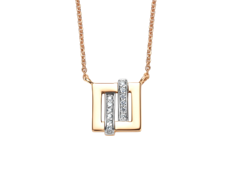 Представляем вам восхитительное золотое колье с бриллиантами из розового золота! Это элегантное колье с квадратным кулоном, в котором располагаются два вертикальных элемента, инкрустированных искрящимися бриллиантами.