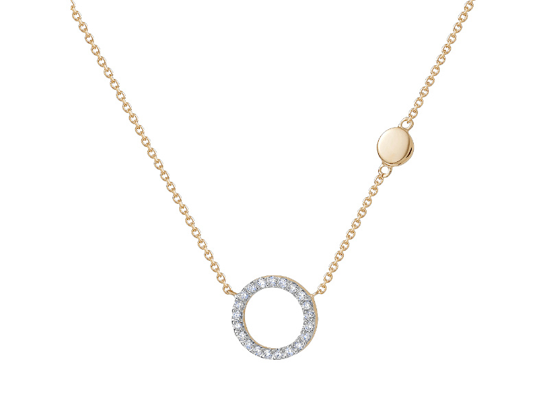 Элегантное золотое колье с бриллиантами — воплощение изящества и современного стиля. Центральный круглый подвес, инкрустированный сверкающими бриллиантами, подчёркивает уникальность этого украшения. Лаконичный дизайн и нежная цепочка из золота делают это колье универсальным аксессуаром для любого случая.