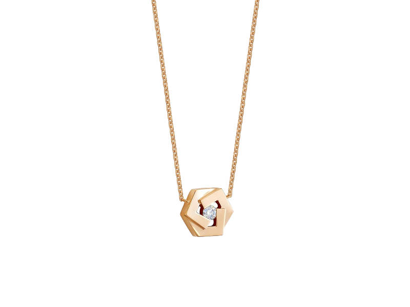 Колье украшено изысканным шестиугольным кулоном, который является настоящим произведением искусства. Его строгие линии и уникальная форма создают смелый, но при этом элегантный вид. В центре кулона сверкает небольшой, но яркий бриллиант, который добавляет изюминку и светящееся сияние, привлекая восхищенные взгляды.