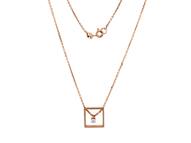 Колье в форме изящного квадрата, выполненный из золота 585 пробы, создает ощущение строгости и утонченности. Внутри этого квадрата преломляется свет благодаря маленькому бриллианту, который невидимо колеблется и источает мягкое сияние, привлекая взгляды к своему владельцу.