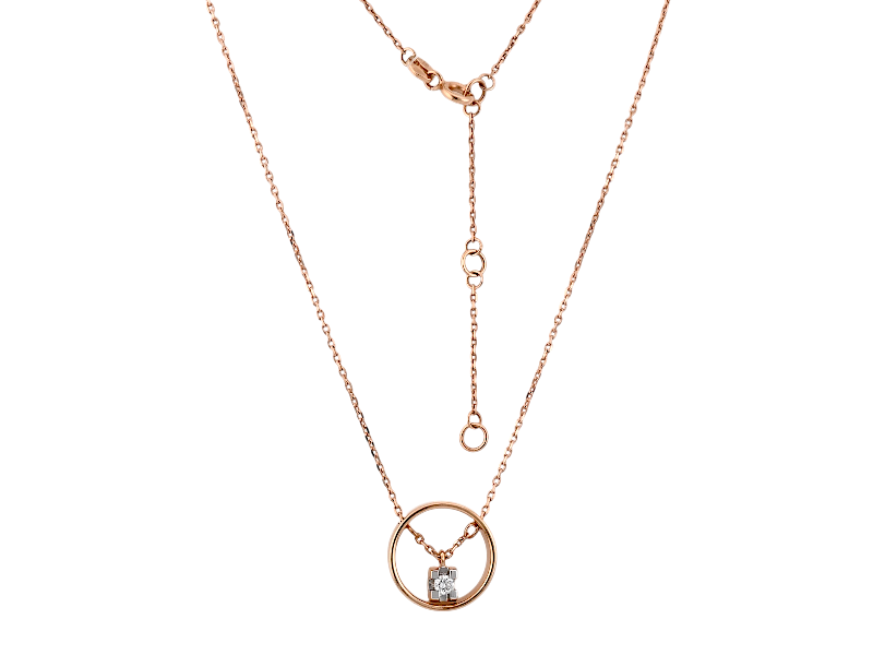 Это стильное золотое колье выполнено из утончённой цепочки с центральной круглой подвеской. Внутри подвески закреплён сверкающий бриллиант, который придаёт украшению особенный акцент и роскошное сияние. Элегантная застёжка позволяет удобно регулировать длину изделия.