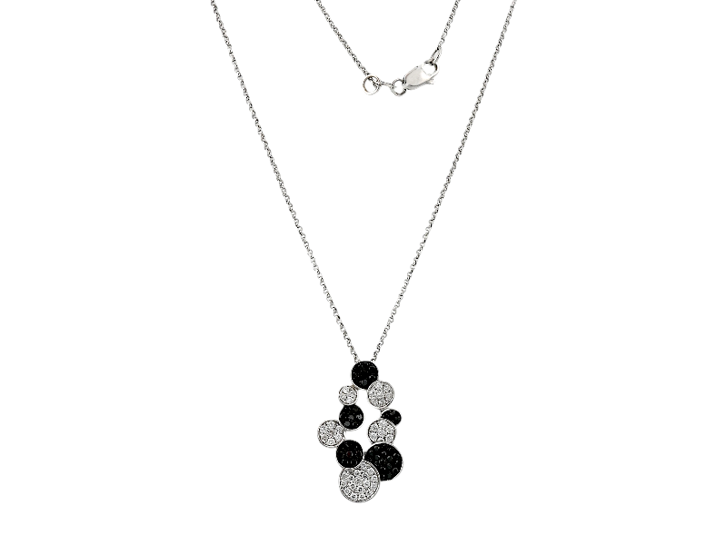 Это элегантное колье из белого золота станет настоящим шедевром в коллекции украшений. Оно излучает роскошь и стиль благодаря уникальному дизайну, который выделяет его среди других. Подвеска состоит из нескольких круглых элементов разного размера, расположены вертикально. Каждый круг украшен черно-белым узором, создающим эффект многослойности и динамики. Вставки из черных бриллиантов, сверкающие на фоне белого золота, добавляют в общий дизайн загадочность и шик.