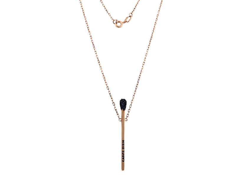 Подвеска в форме спички, с черной головкой, добавляет нестандартный акцент и неповторимый шарм этому украшению. На стержне спички вертикально написано "CARPE DIEM", что переводится как "Лови момент". Эта вдохновляющая надпись станет напоминанием о том, чтобы жить полной жизнью и ценить каждое мгновение.