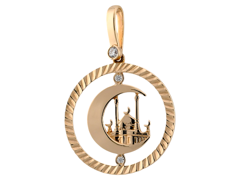 Изысканная мусульманская подвеска в форме полумесяца из красного золота 585 пробы, инкрустированная сверкающими фианитами.
