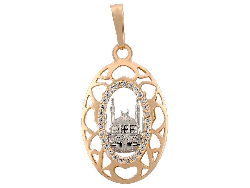 Изысканная мусульманская подвеска в форме мечети из красного золота 585 пробы, украшенная сверкающими фианитами. Это украшение сочетает в себе духовность и элегантность, добавляя блеск и утонченность Вашему образу.  Идеальный выбор для тех, кто чтит традиции и любит изысканные детали!