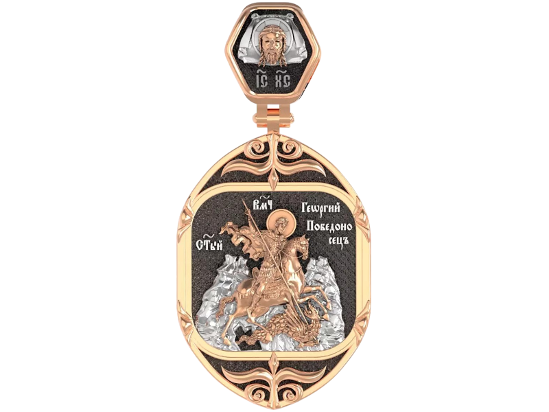 Основой композиции лицевой стороны является изображение Святого Георгия Победоносца. Образ Великомученика считают одним из наиболее чтимых святынь в Святыни Православных, он олицетворяет собой заступника для верующих, чья жизнь имеет какое-либо отношение к военным делам, также он может оберегать и землевладельцев. Одно из самых великих чудес которое сотворил Великомученик так это – спасения всего города от устрашающего змия. Молитвами и своей непреклонной верой, взываемой к Всевышнему, он смог одолеть чудовище. Святой убил змея, спас жителей и их души от влияния дьявола, породив в них надежду и веру в Господа, призывая людей принять христианскую веру. Поскольку при жизни св. Георгий был военным, он считается покровителем всех, кто имеет отношение к армии — военнослужащим, участникам боевых действий. Молитва перед иконой Георгия Победоносца поможет защититься от врагов, одержать победу в сражении (военном, спортивном, духовной брани с дьяволом), содействие в установлении мира между членами семьи, избавиться от телесного недуга. На кулонном кольце изображен Спас Нерукотворный - Символ вочеловечившегося Божества.