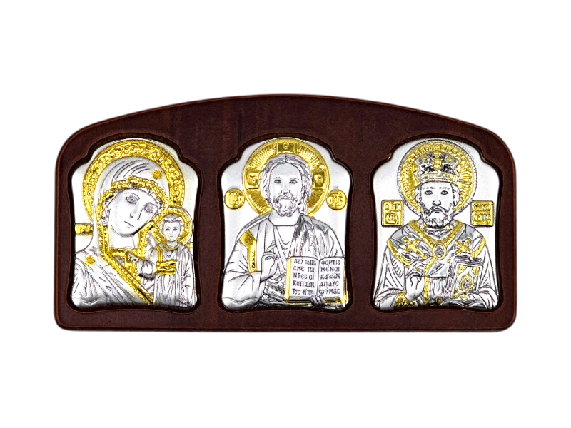 Икона-триптих для автомобиля состоит из трех икон, где традиционно изображаются центральный образ Спасителя, Богородицы и святого покровителя, Николая Чудотворца. Компактный размер делают её удобной для размещения на приборной панели или в бардачке.