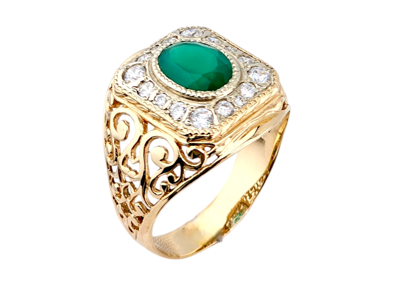 Роскошная печатка из красного золота 585 пробы, украшенная глубоким зеленым агатом и сверкающими фианитами. Этот стильный аксессуар сочетает в себе элегантность и утонченную красоту, подчеркивая индивидуальность своего обладателя.