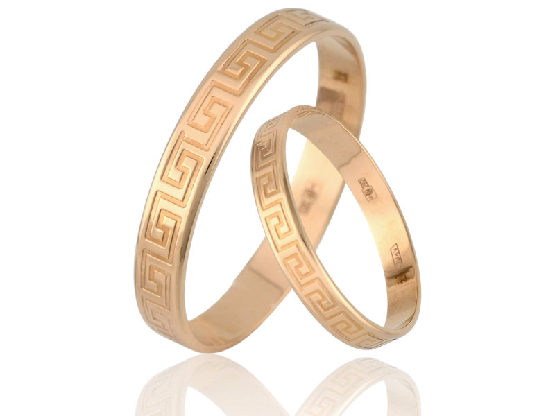 Это элегантное обручальное кольцо выполнено из высококачественного красного золота 585 пробы. Его главная особенность — изысканный греческий орнамент, который символизирует гармонию, вечность и прочную связь между двумя любящими сердцами.