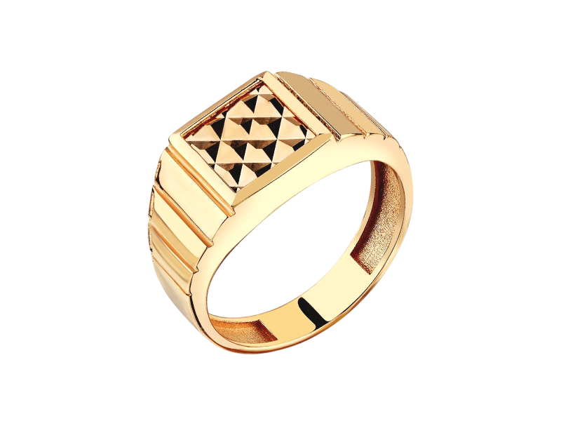 Мужская печатка из красного золота 585 пробы с алмазной обработкой (алмазной гранью). Вместо вставки камня поверхность кольца украшена специальными насечками, нанесенными алмазным резцом. Это создает уникальную игру света и фактуру, придавая перстню блеск и оригинальность без использования камней. Стильный и лаконичный выбор для мужчин, ценящих сдержанную элегантность.