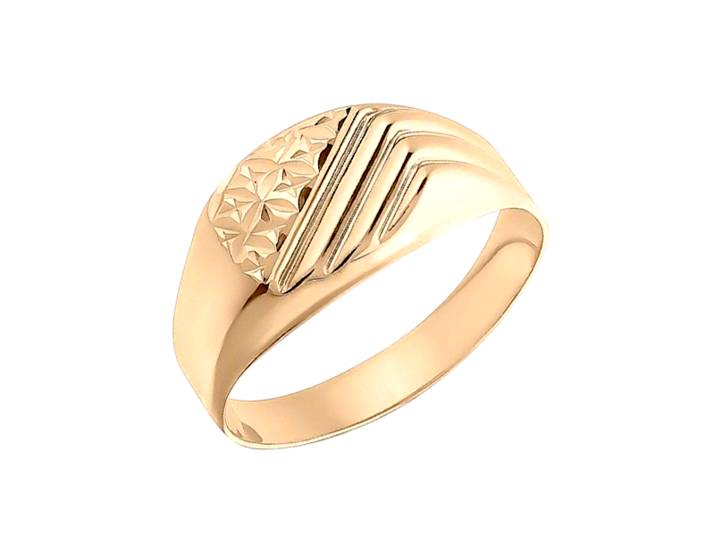 Мужская печатка из красного золота 585 пробы с алмазной обработкой (алмазной гранью). Вместо вставки камня поверхность кольца украшена специальными насечками, нанесенными алмазным резцом. Это создает уникальную игру света и фактуру, придавая перстню блеск и оригинальность без использования камней. Стильный и лаконичный выбор для мужчин, ценящих сдержанную элегантность.