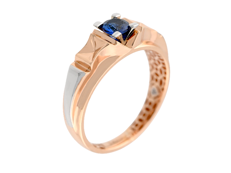 Мужская печатка из золота 585 пробы. Центральным элементом является круглый сапфир насыщенного синего цвета, закрепленный в лапках из белого золота. Дизайн печатки сочетает в себе элементы из розового и белого золота, с геометрическими деталями по бокам от центрального камня. Шина кольца украшена ажурным узором. Изысканный аксессуар!