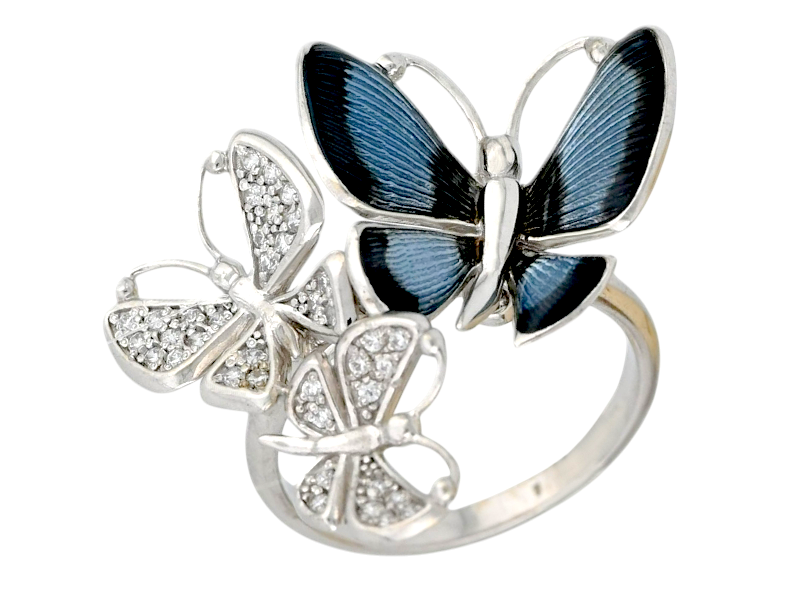 Кольцо "Бабочки" – это воплощение легкости, грации и свободы.  Оригинальный дизайн из трех изящных бабочек, выполненных из белого золота, фианитов и эмали, создает неповторимый эффект. Это кольцо станет ярким акцентом Вашего стиля и подчеркнет Вашу утонченность и наполнит Ваш образ нежностью и романтикой.