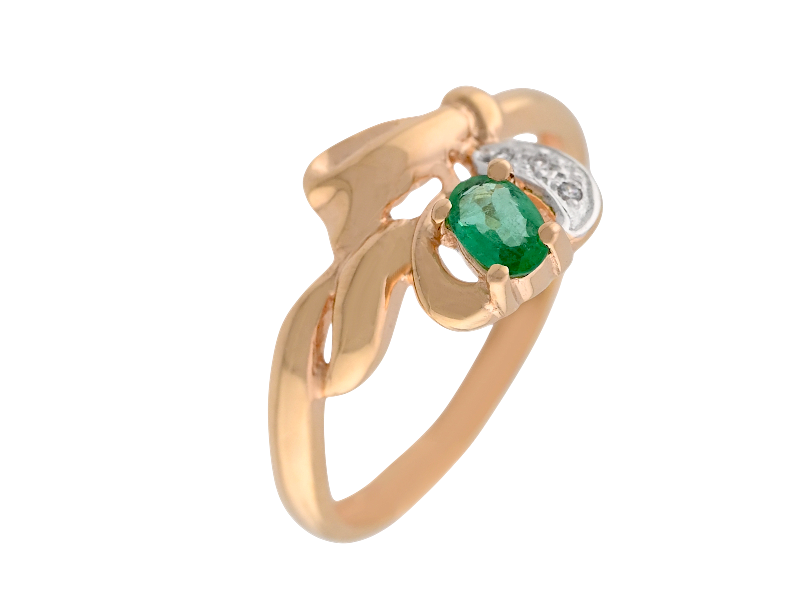 Кольцо выполнено из золота 585 пробы и имеет изящный дизайн. Центральным элементом является вставка из изумруда овальной формы, окруженная мелкими фианитами, которые добавляют блеска и сияния. Изумруд символизирует мудрость и терпение, а его глубокий зеленый цвет успокаивает и гармонизирует.
