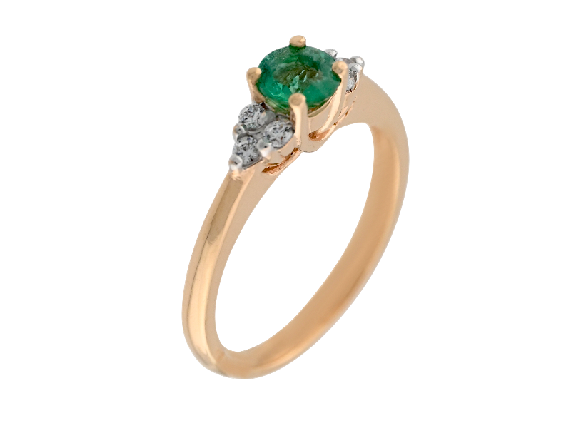 Кольцо выполнено из золота 585 пробы и имеет изящный дизайн. Центральным элементом является вставка из изумруда круглой формы, окруженная мелкими фианитами, которые добавляют блеска и сияния. Изумруд символизирует мудрость и терпение, а его глубокий зеленый цвет успокаивает и гармонизирует.