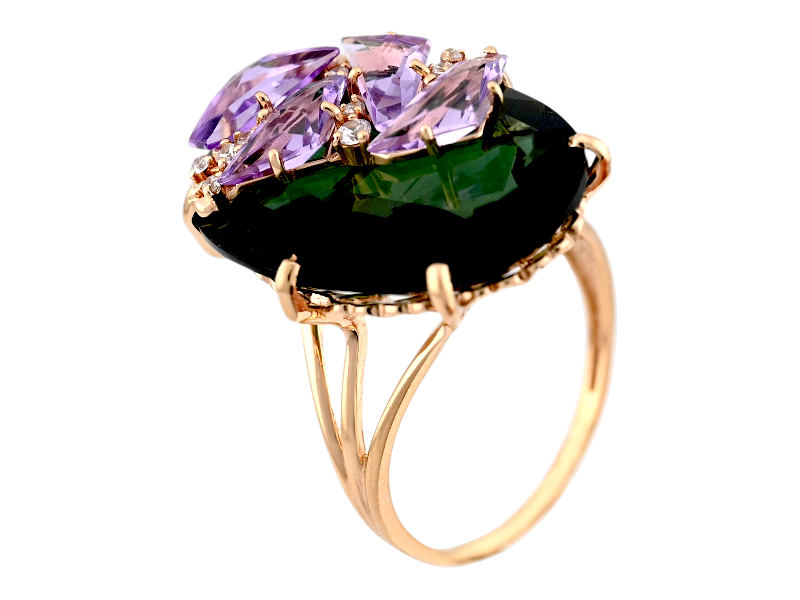 Золотое кольцо с турмалином и аметистом - это восхитительное сочетание красок и текстур, которое подчеркнет Вашу индивидуальность и утонченный вкус! Турмалин и аметист прекрасно дополняют друг друга, создавая гармоничный союз. Турмалин символизирует любовь и нежность, а фиолетовый аметист - спокойствие и мудрость. Вместе они создают ощущение баланса и гармонии. Нося это кольцо, Вы будете чувствовать себя особенной и неповторимой.  Оно станет ярким акцентом Вашего образа и подчеркнет Вашу утонченность и изысканный вкус.
