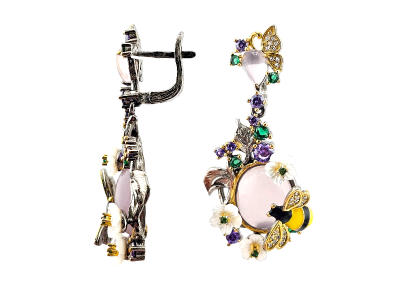 В центре украшения — нежный розовый кварц, окруженный изящными цветами из перламутра, создающими ощущение весенней свежести и красоты. В дополнение — миленькая пчелка с яркой эмалью, которая придает изделию игривость и уникальность. Идеальный аксессуар для тех, кто любит нежность и природную гармонию!
