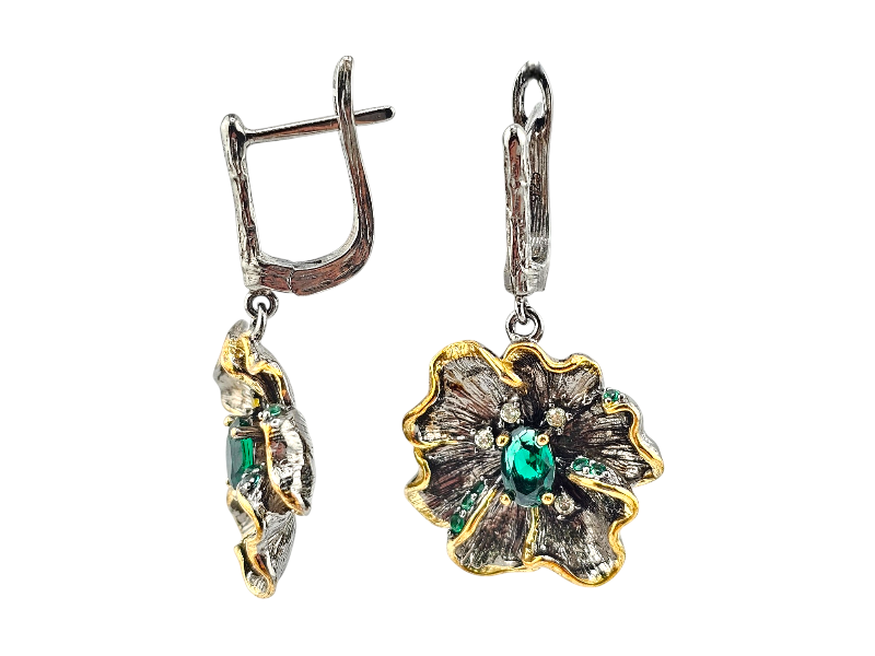 Эти эффектные серьги выполнены в форме крупного цветка из серебра с покрытием черным родием, создающим контрастный и стильный вид. Лепестки украшены яркими зелеными и желтыми синтетическими шпинелями, а их края подчеркнуты изящной позолотой. Идеальный аксессуар для создания яркого и запоминающегося образа!