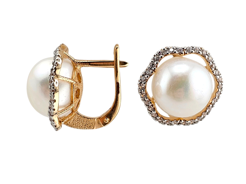Эти изысканные золотые серьги станут настоящим украшением вашей коллекции. В центре композиции — натуральная белая жемчужина крупного размера, которая притягивает взгляды своим мягким перламутровым сиянием. Вокруг жемчужины изящно выложена дорожка из сверкающих фианитов, образующая элегантный цветок. Такое оформление придаёт серьгам утонченность и особый блеск.