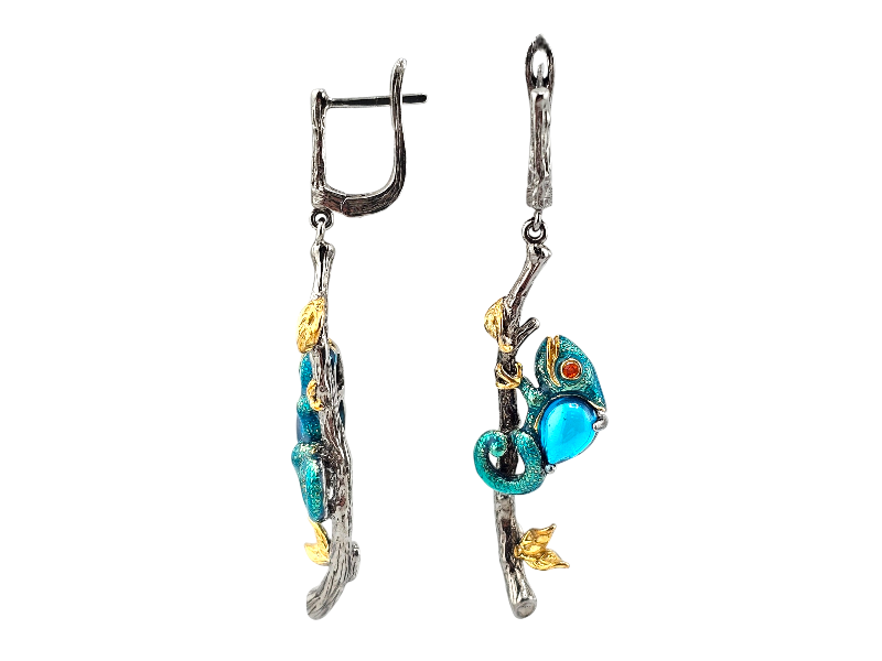 Эти изысканные серьги выполнены из серебра и украшены детализированной фигуркой хамелеона, сидящего на ветке. В качестве акцента использован яркий голубой фианит, ограненный в форме кабошон, придающий серьгам мягкое сияние. Идеальный выбор для любителей оригинальных украшений и природной тематики!