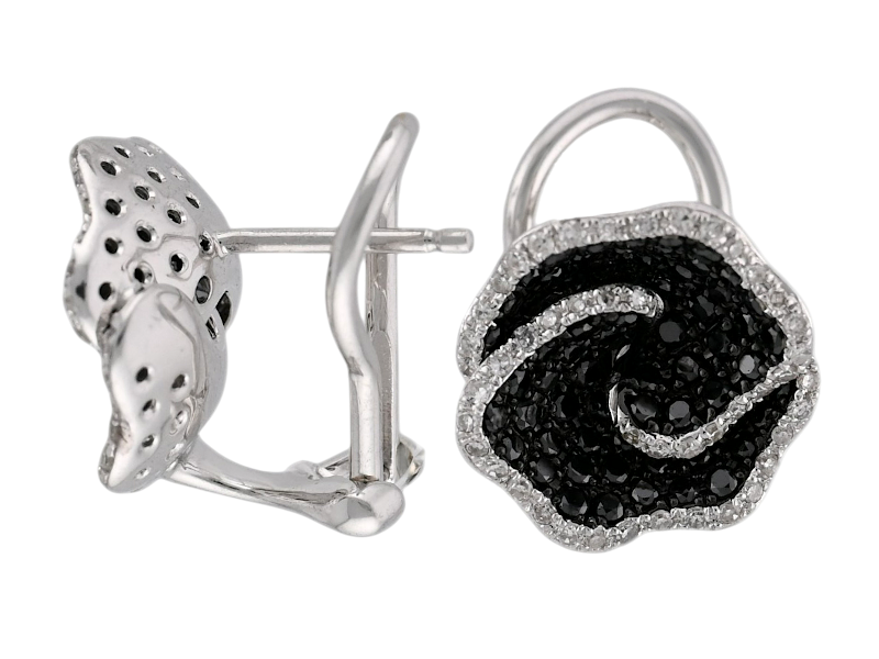 Пленительные серьги из белого золота, которые воплощают в себе таинственность ночи и изысканность высокой моды! Белое золото, словно лунный свет в темном саду, подчеркивает загадочную красоту черных бриллиантов, создавая завораживающий контраст.  Каждый черный бриллиант, искусно ограненный в форме цветка, словно миниатюрная черная роза, символ страсти и неповторимости. Эти серьги – не просто украшение, это statement, выражающее Вашу индивидуальность и смелый характер. Они идеально подойдут для тех, кто ценит оригинальность и не боится выделяться из толпы. Представьте, как эти серьги будут покачиваться в такт Вашим движениям, притягивая восхищенные взгляды и подчеркивая Вашу уверенность и стиль.  Они станут прекрасным дополнением к вечернему платью или элегантному повседневному образу.