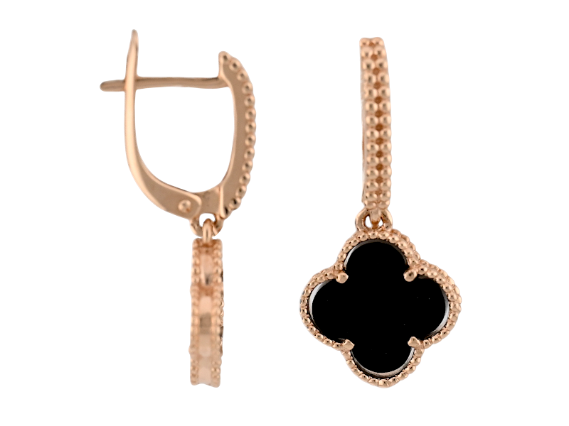 Золотые серьги в виде клевера с черным агатом