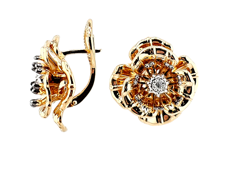 Погрузитесь в магию изящества с нашими золотыми объёмными серьгами в форме роскошных цветов! Эти украшения изготовлены из высококачественного золота 585 пробы и декорированы сверкающими натуральными бриллиантами, что придаёт им особое мерцание и эффектный вид.