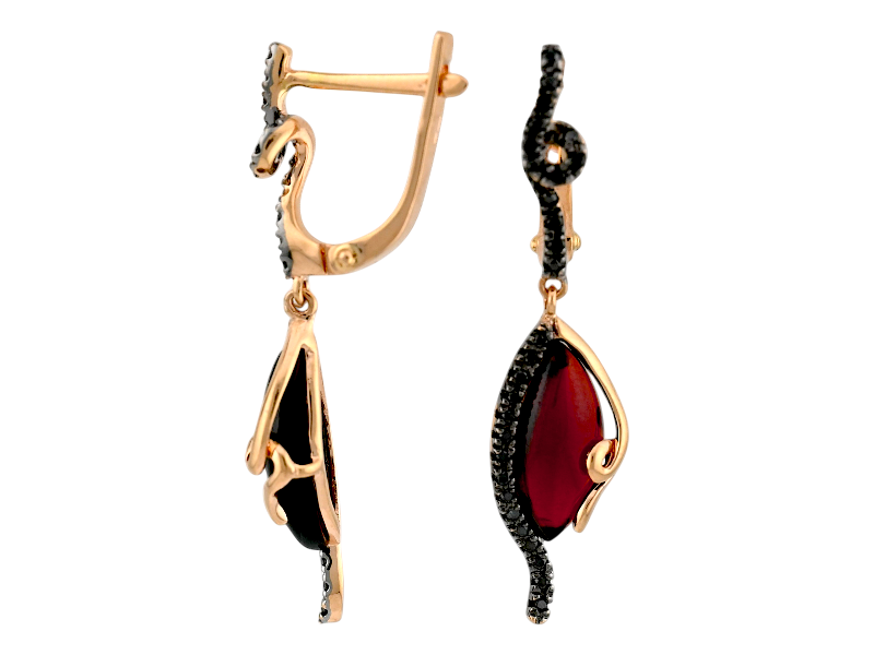 Золотые серьги с гранатом и черными бриллиантами - насыщенный гранат, окруженный таинственным сиянием черных бриллиантов, — это украшение, которое раскрывает характер. Глубокий винный оттенок камня играет в золоте, а россыпь тёмных искр добавляет драматичности и современного шарма. Эти серьги — о смелости, стиле и магнетизме.
