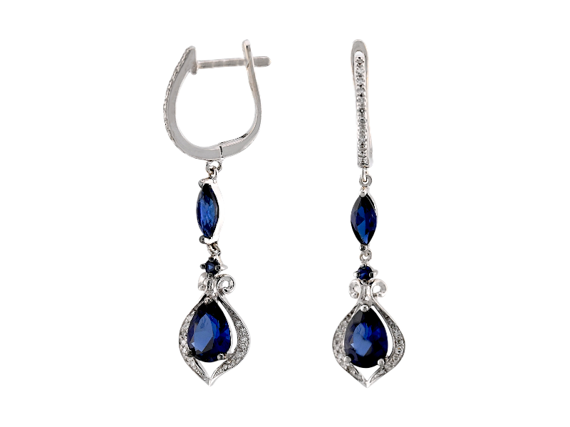 Серьги из белого золота с подвесным элементом, сапфирами и бриллиантами – это воплощение грации и изящества! Подвесной элемент добавляет серьгам динамичности и легкости. Он мягко покачивается при движении, привлекая внимание к Вашему лицу. Синтетические сапфиры в подвеске, словно капельки ночного неба, придают серьгам глубину и загадочность, бриллианты подчеркивают красоту сапфиров и добавляют серьгам роскоши.