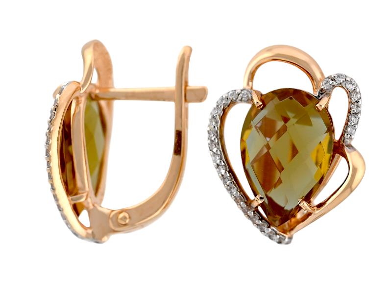 Элегантные серьги из благородного красного золота 585 пробы. Султанит магический камень, при смене освещения он меняет цвет. На солнце появляются оттенки желтого от светлого янтаря до коньячно коричневого,при искусственном освещении, в сумерках вставка выглядит ярко-зеленой. Эффектные серьги современного дизайна гармонично впишутся в любой наряд, сделают его изысканным, добавят шик, подчеркнут хороший вкус обладательницы