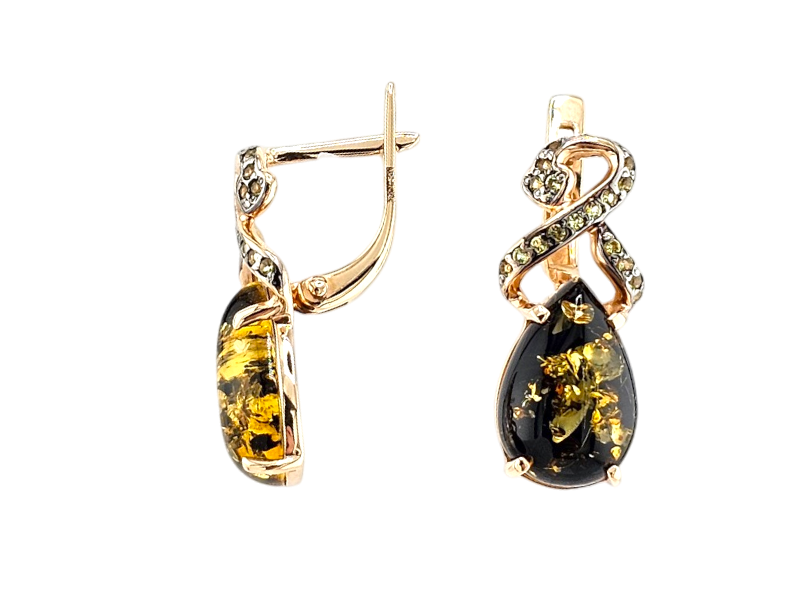 Золотые серьги с зеленым янтарем