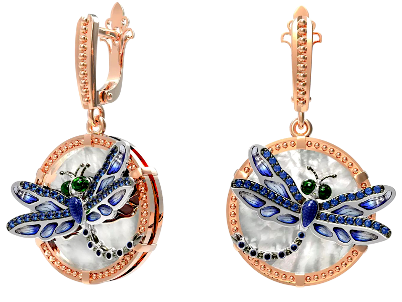 Золотые серьги Стрекозы с сапфирами и перламутром